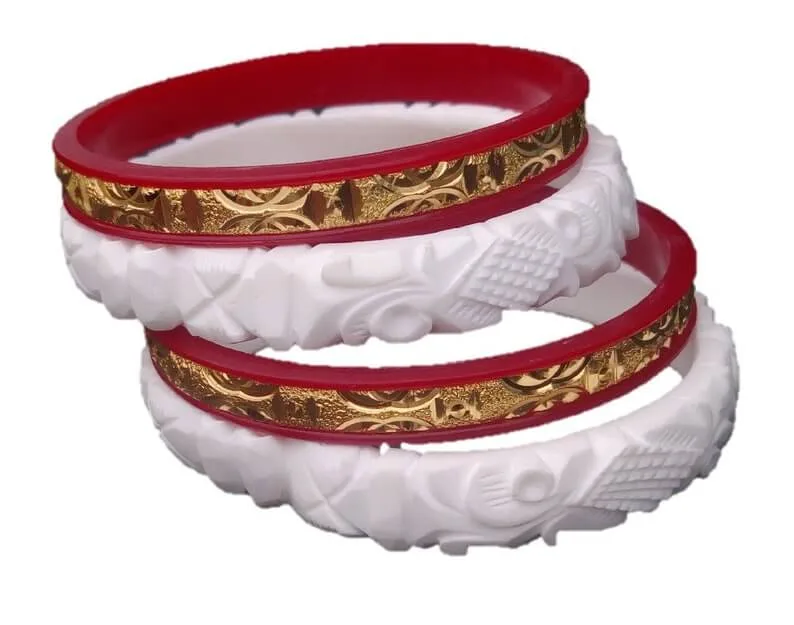 Enhance your ethnic charm with this stylish set of red and white bangles, beautifully decorated with a golden floral embossed design. The combination of deep red borders, pure white carved texture, and golden detailing makes this set unique and eye-catching.
