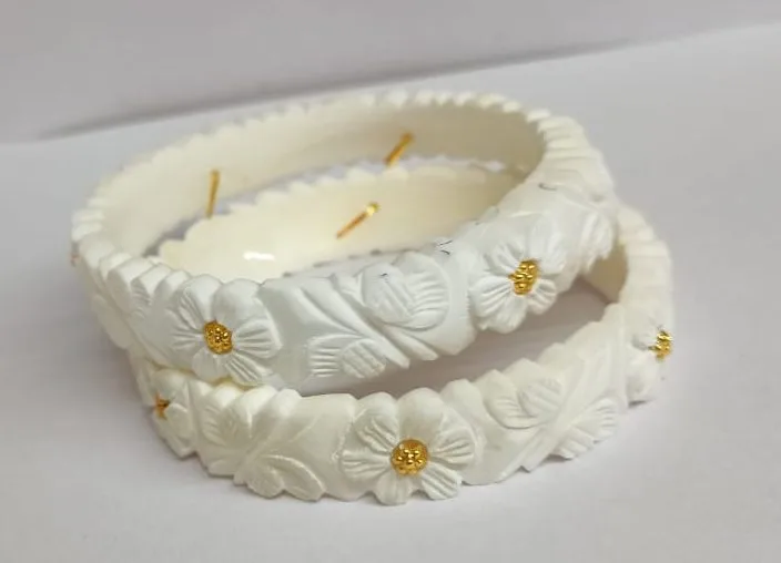 Enhance your ethnic style with this pair of white carved bangles for women, beautifully adorned with delicate golden floral motifs. Handcrafted by skilled Indian artisans, these bangles combine traditional charm with modern elegance, making them an essential accessory for every jewellery collection.